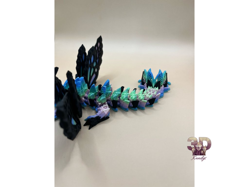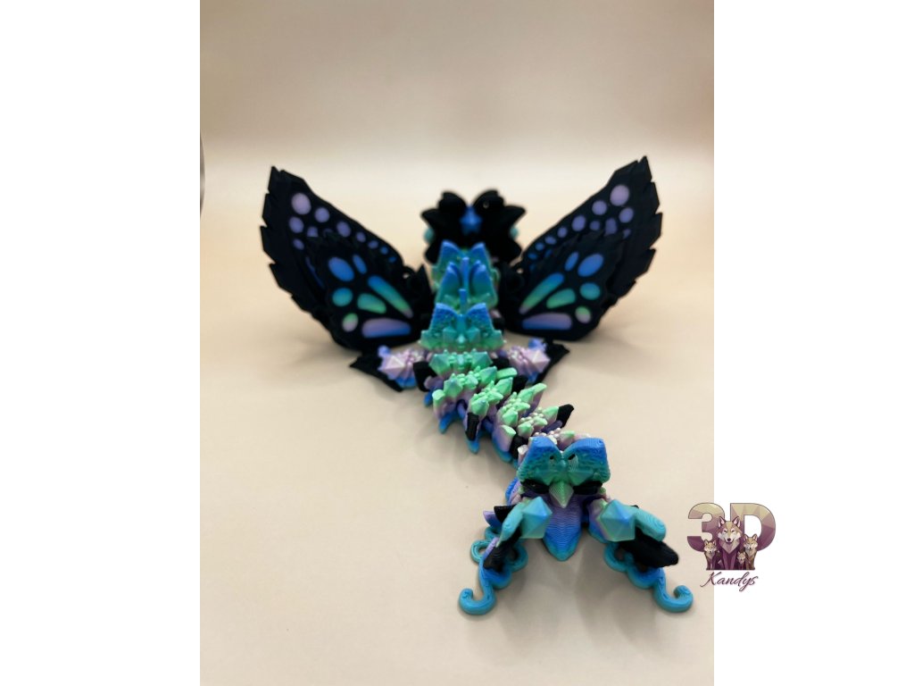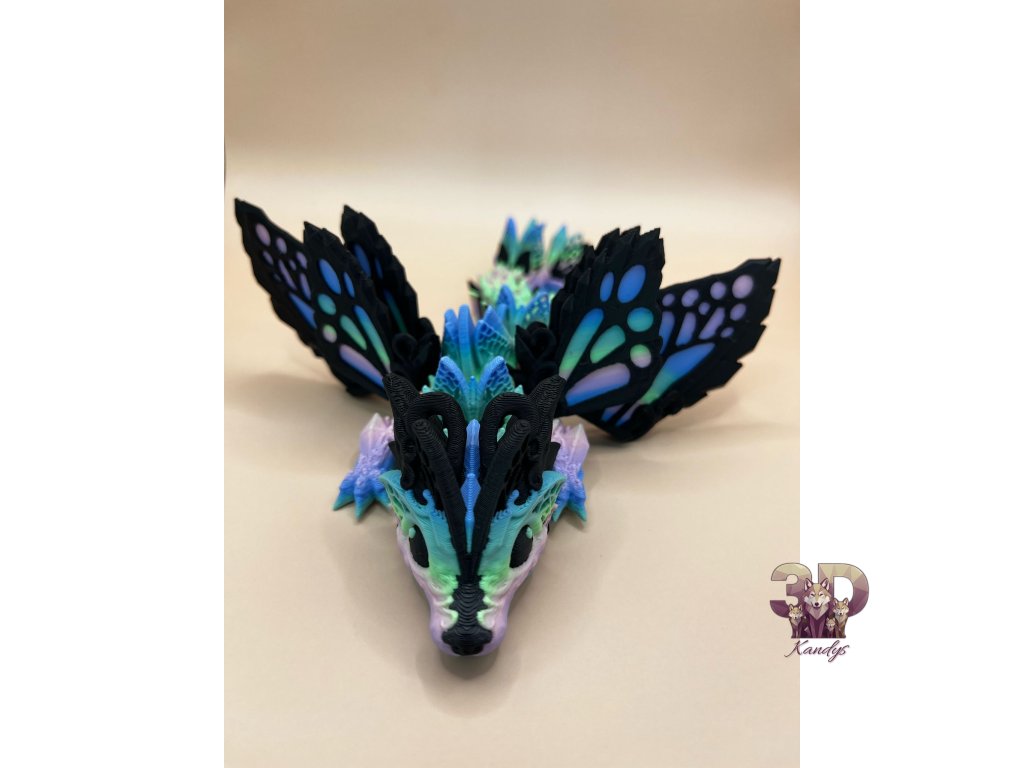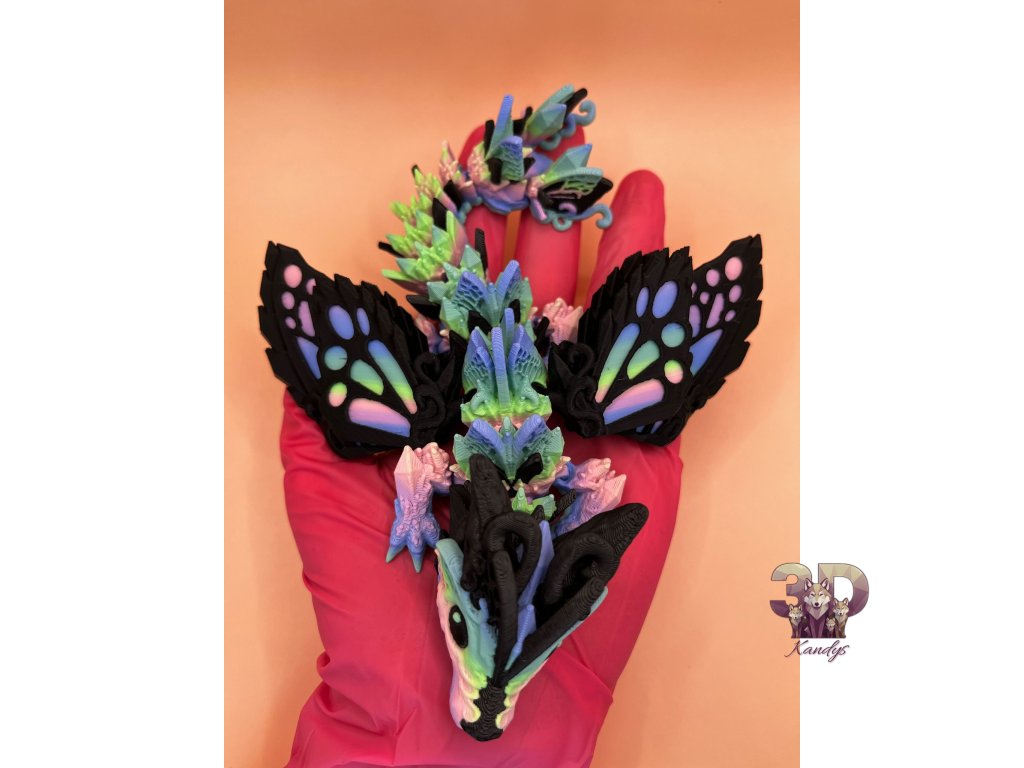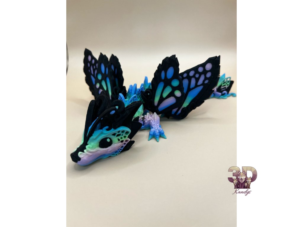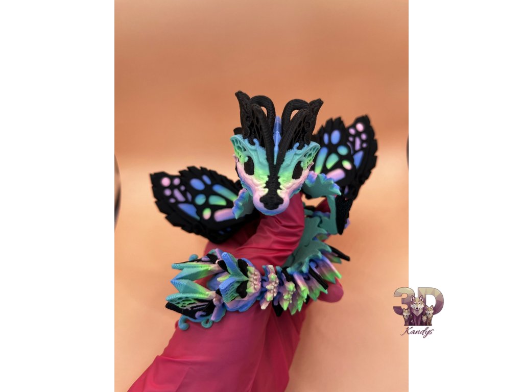 Tenhle dráček má styl. Křídla jako z vitríny v entomologickém muzeu, barvy jako ze snu cukrové víly a detaily, které tě donutí zírat. Vypadá, jako by právě vystoupil z magického portálu přímo na tvou poličku. Kombinace pastelových odstínů, sytě černých kontrastů a detailů, které fakt nejsou z tohoto světa – tohle je sběratelský klenot, co si žádá pozornost.